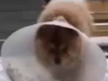 うちの犬はエリザベスカラーをつけていた。外は少し雪が積もっている → 犬はこうします…