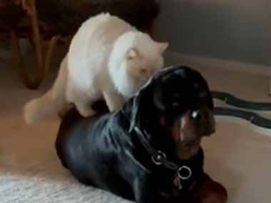 ネコが犬の背中に乗っていた。お腹もお願いだワン♪ → 猫、ベテランのマッサージ師です…