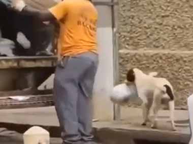 【イヌ】 ゴミ収集車で作業をしていると犬がやってきた。遊んでほしいのかな? → いいえ、お手伝いです…