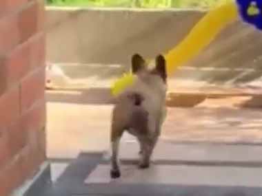 滑り台に近づくワンコ。