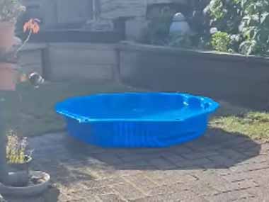 【イヌ】 庭に子供用プールを置いてみた。初めての体験! → 犬は段々とこうなります…