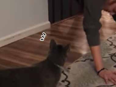 【ネコ】 お姉さんが壁を使ってこんなポーズをしてみる。できるかな? → 猫はこうした…
