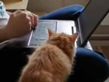 【ネコ】 私が膝にノートPCを置いて作業をしていた。お邪魔するにゃ♪ → 猫とのたたかいが始まった…