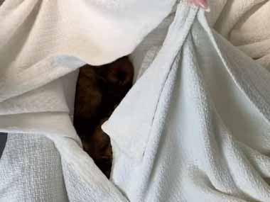 【子イヌ】 布の中には何があるの? そっと広げてみた → 子犬、みっちりです…