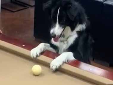 うちのイヌが「ビリヤード台」に前足を乗せていた。目の前に球を置いてみる → ハスラー犬はこうします…