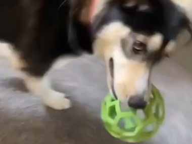 うちのイヌがおもちゃのボールを咥えていた。イェイイェイ♪ → ダンス犬はこちらです…