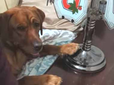 うちの犬がテーブルランプに前足を乗せていた。その鼻を触ってみる → こうなります…
