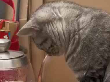 うちの猫がポットを気にしていた。注ぎ口に鼻をくっつける → 中の水はこうなります…