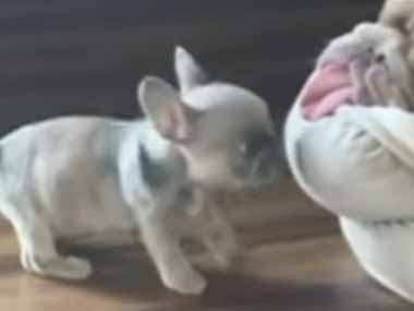 イヌが舌を出したままぐっすり寝ていた。パクパク、えいえい♪ → 子犬はこうする…
