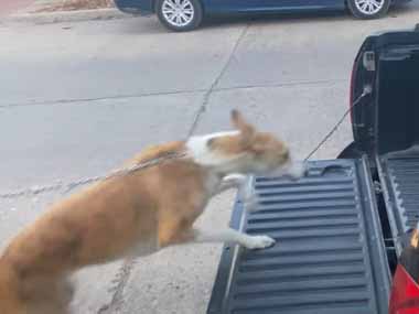 イヌが車の荷台に飛び乗った。ほら、がんばって! → もう1匹にこうします…