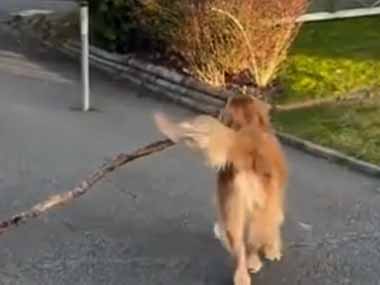 イヌが長い木の枝を運んでいた。前方には車止めがある。引っかかるんだろうな → と思ったら…
