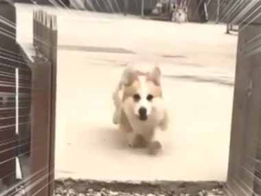 イヌが開いた扉から出てくる。コーギーが1匹、コーギーが2匹 → いったい何匹いるの…