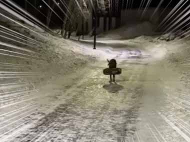 イヌが雪道をやってくる。トレーニング中ですか? → タイヤ犬はこちらです…