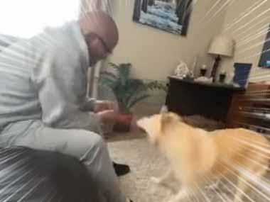 イヌとお父さんが「おもちゃ」の引っ張り合いをしていた。離さんぞぉ! → こうなる…