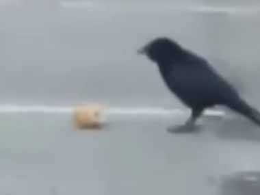 カラスが地面に落ちている食べ物をつついていた。そこにネズミが近づいた → やさしいカラスはこうします…