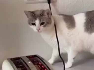 ネコがトースターの横にいた。…ん?何か音がするけど気のせいかにゃ? → こうなる…