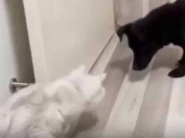 ネコが壁と扉の隙間からカリカリを取り出す。それを勝手に子犬が食べた → 気づいた猫はこうなった…