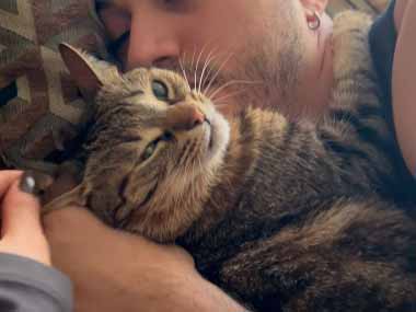 ネコが彼氏にくっついて寝転んでいた。私がその頭を優しく撫でる → すると猫はこうなった…