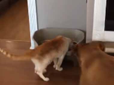 ネコが犬のゴハンを勝手に食べていた。ダメだよ → やさしい犬はこうします…