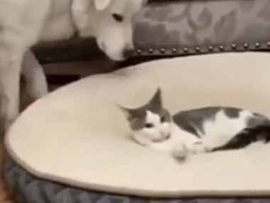 ネコが犬のベッドでくつろいでいた。そこに犬がやってくる。どうなるの? → 犬はこうした…
