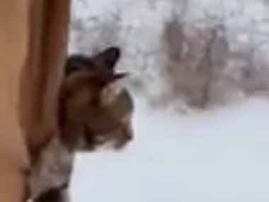 ネコが飼い主と一緒に散歩する。雪の日でもあったかい♪ → 猫はこうなる…