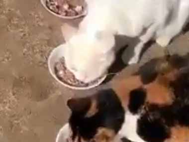 ネコたちが並んでゴハンを食べていた。1匹、2匹、3匹… → いっぱいです…