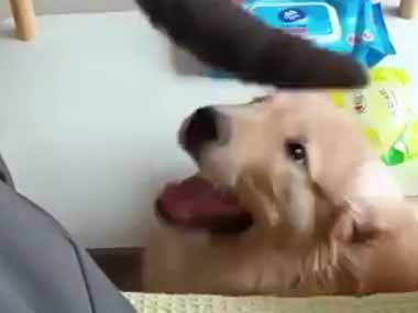 ネコの尻尾がぶら下がっていた。子犬がガブガブしちゃう → 教育的指導、入ります…