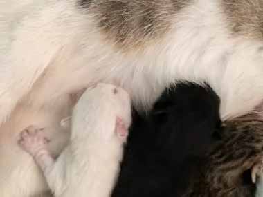 ネコの赤ちゃんたちは授乳の時間。こっちくんにゃぁ! → 黒と白の毛玉はこうなる…