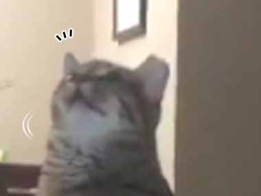 ネコの隣でヘアバンドを引っ張ってみる。バチンッ! → 猫はこうなる…