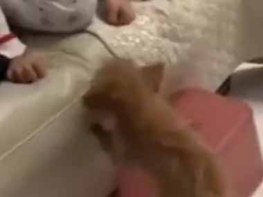 子イヌがソファの上にのぼれない。こうやるんだよ。女の子が教えてみた → 結果…