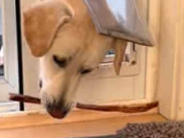 子イヌが棒を取ろうとするけどペットドアに引っかかる。でも頑張って取れた! → 子犬は何かに気づいたようです…