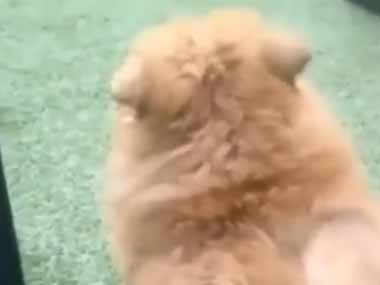 子イヌが部屋から外に出ようとした。トコトコトコ…あれれ? → 窓の段差にこうなっちゃう…