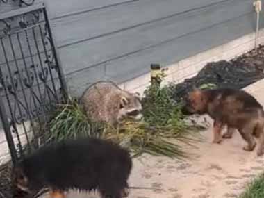 子イヌたちが庭で遊んでいた。アライグマもいる → 仲良しはこうなります…