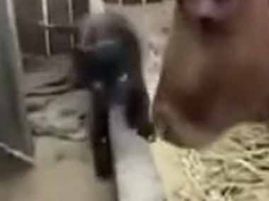 子ネコが牛小屋で遊んでいた。歩くたびに牛たちに突かれる。でも子猫はめげなかった → 結果…
