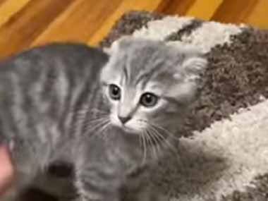 子ネコが私の手に威嚇する。かかってこいにゃ! → 猫拳の使い手はこの構えです…