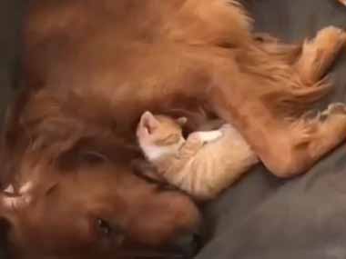 子ネコと犬はとても仲良しだった。腕の中でお眠り♪ → 2匹の姿にほっこりです…