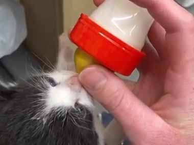 子ネコに哺乳瓶でミルクをあげていた。待ちきれないにゃぁ! → クレートの子猫はこんな感じ…