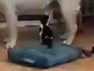 子ネコの目の前に犬がやってきた。ロデオタイムにゃ♪ ちょっ! → 子猫はこうしちゃう…