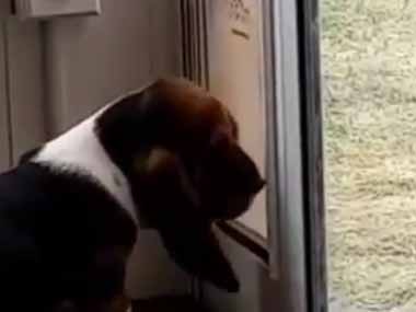 子犬がペットドアで立ち往生。ほら、こうやるんだよ → 親犬が教えます…