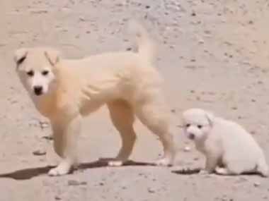 小さな子イヌが犬にくっついていた。少し犬が移動する。すぽっ♪ → おチビちゃんはこうなります…