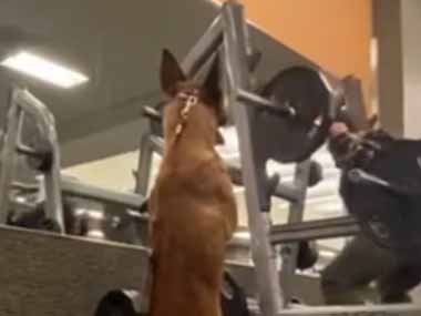 犬がジムの中にいた。男がバーベルスクワットを始める → 犬コーチはこうします…