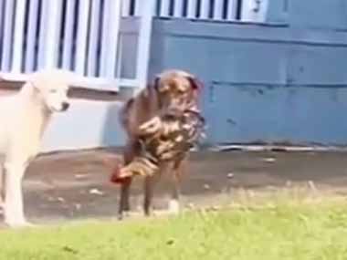 犬がニワトリを捕まえてきた。獲物ゲットだワン! → すると…