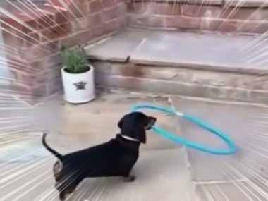 犬がフラフープを咥えてやってきた。でも突っかかって階段を登れない → 結果…