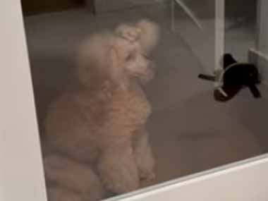 ドアの向こうで待っているワンコ。