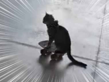 猫がスケボーに乗っていた。前方には壁がある。ぶつかっちゃうよ! → こうなる…
