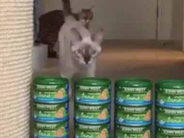 猫缶で壁を作ってみた。ネコたちはどれくらいまで飛び越えられる? → やってみたらこうなった…