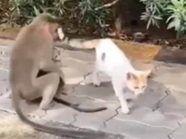 野良ネコがサル一家に近づいて行く。するとどうなるの? → 仲良しはこうなります…