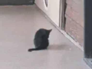 1匹の子ネコが毛づくろいをしていた。近くにはペットドアがある → こうなる…