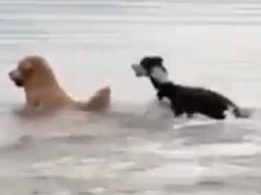 2匹のイヌが湖で遊んでいた。ヒャッハ~! → 1匹のテンションはこうなります…