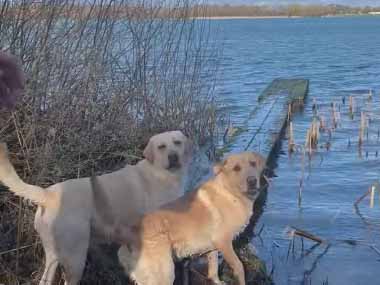 2匹のイヌと湖のほとりで遊んでいた。桟橋で取ってこい! → こうなった…